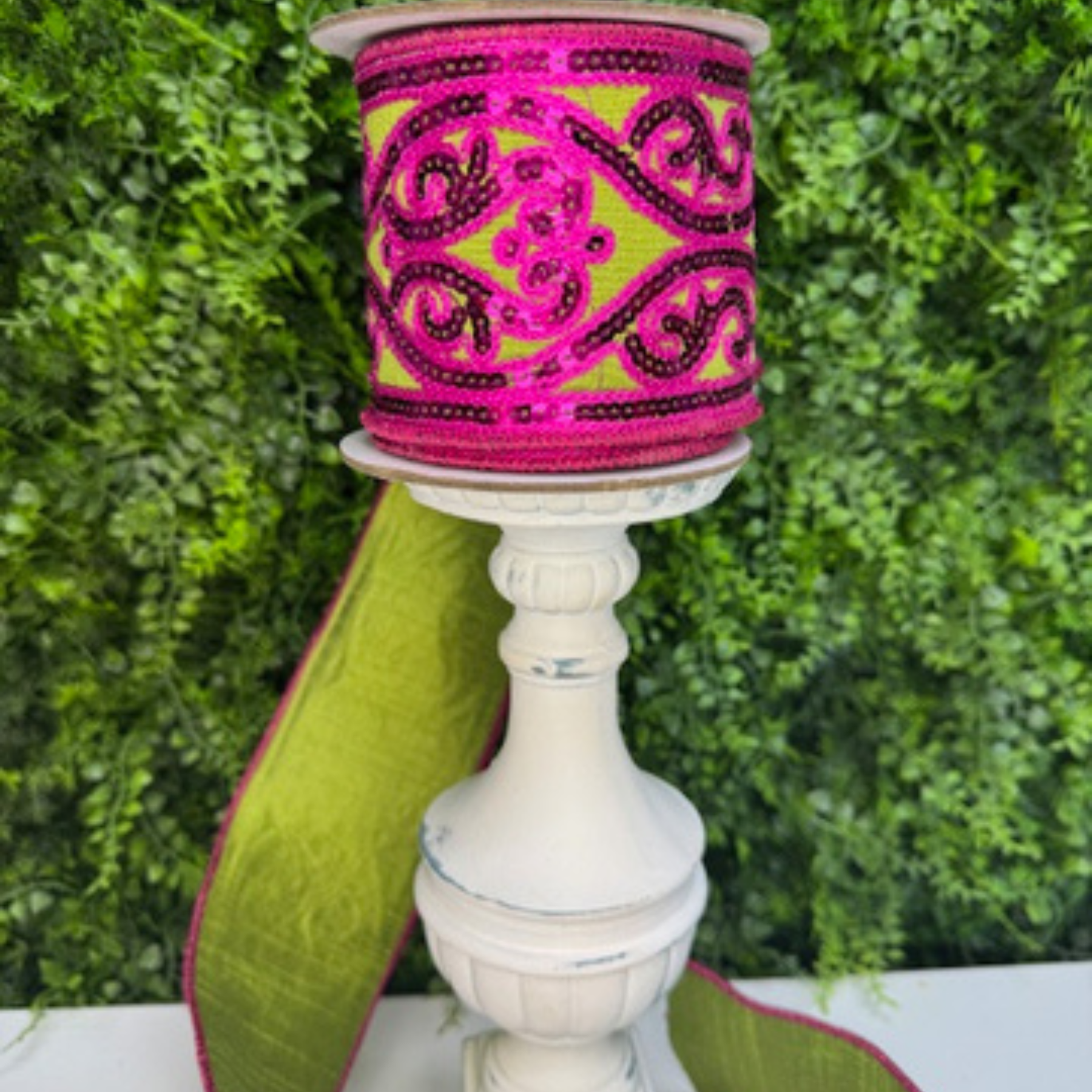 Make a bold, unforgettable statement with this luxury designer ribbon featuring vibrant lime green fabric adorned with intricate Hot Pink embroidered scrollwork and shimmering sequins. This high-end ribbon delivers the perfect balance of color contrast, texture, and dimension—ideal for elevated wreath designs, statement bows, and upscale seasonal décor.